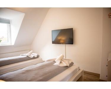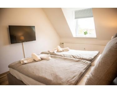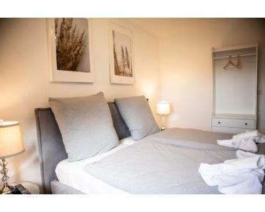 Aktuell wird die Wohnung als Ferienwohnung genutzt, weshalb auf den Fotos in einem Zimmer ein Doppelbett und im anderen zwei Einzelbetten zu sehen sind – die Möblierung wird jedoch selbstverständlich angepasst.