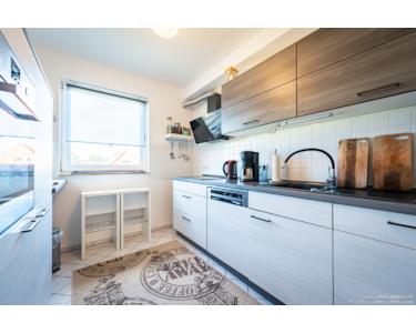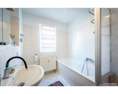Die angrenzende Küche und das Tageslichtbad mit einer Badewanne sind funktional gestaltet und bieten angenehmen Komfort im Alltag.