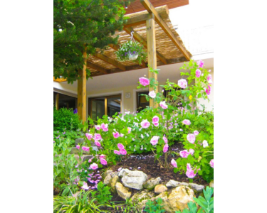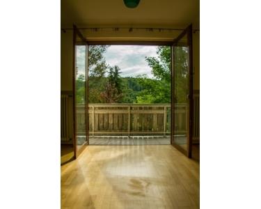 Die Doppelflügeligen Glastüren in Diele und Schlafzimmer lassen sich komplett öffnen und lassen so drinnen und draußen angenehm verschmelzen.
