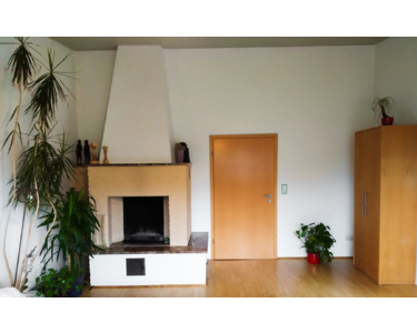 Hier befindet sich noch ein offener Kamin und eine Glashebetür mit Zugang zum Balkon.