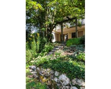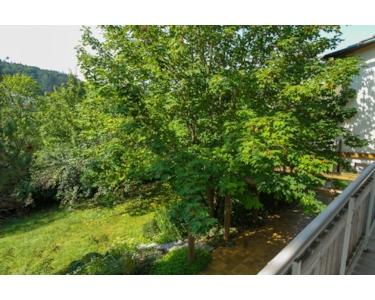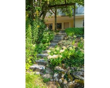 Der schön eingewachsene Garten und die große Terrasse so wie der raffiniert verbreitete Balkon geben den Blick frei in ein geschütztes Tal und bieten Ruhe und südliches Flair.