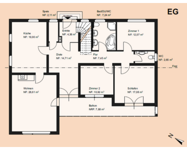 Durch eine Glastür erreicht man die Diele, die links in das Bad, Gäste WC und drei Schlafräume führt. Rechts ist die Küche mit Eßzimmer und das Wohnzimmer zu erreichen.