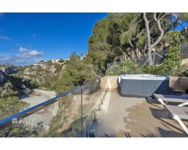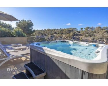 Ob Frühstück im sonnendurchfluteten Essbereich oder ein entspannter Abend auf einer der drei Terrassen: Dieses Zuhause bietet Raum zum Durchatmen, Träumen und Genießen. Besonders spektakulär ist die großzügige Sonnenterrasse mit privatem Whirlpool – hier erleben Sie nicht nur vollkommene Entspannung, sondern auch einen atemberaubenden 200-Grad-Meerblick über die traumhafte Bucht von Cala Pi.