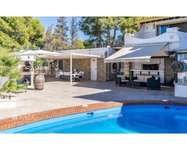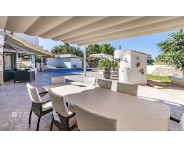 Der Außenbereich ist ideal für mediterranes Wohnen: überdachte und offene Terrassen, ein Swimmingpool mit Lounge-Bereich, ein Garten mit Grillplatz, eine Sommerküche sowie eine gemütliche Chillout-Zone.