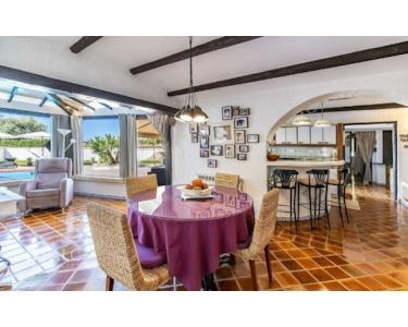 Auf einer bebauten Fläche von ca. 436 m² verteilen sich die Räumlichkeiten großzügig auf zwei Etagen. Im Erdgeschoss befinden sich das helle Wohn-/Esszimmer mit Kamin, hohen Decken und offen gestalteter Galerie sowie eine voll ausgestattete Küche. Vom Wohnbereich aus gelangt man auf eine große Terrasse und zum Pool.