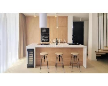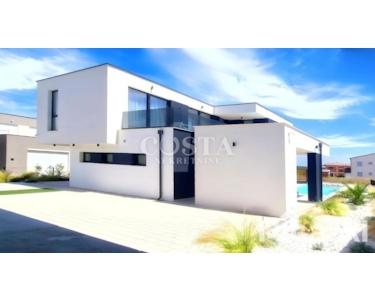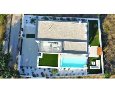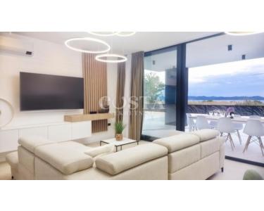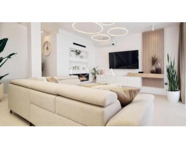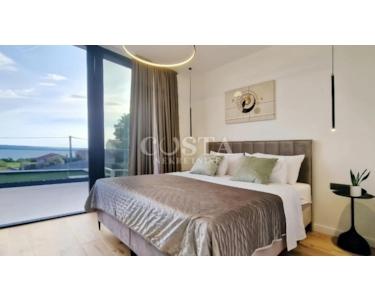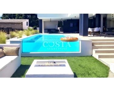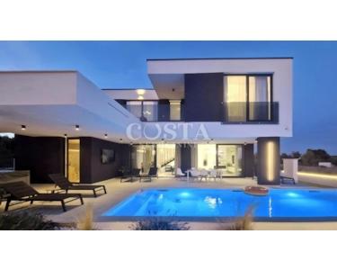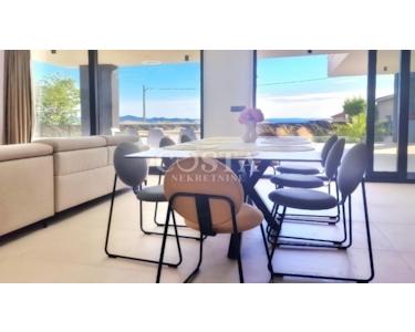 Diese moderne Luxusvilla mit einer Gesamtfläche von 240 m² steht in Kožino bei Zadar auf einem 570 m² großen Grundstück zum Verkauf. Das Anwesen besticht durch hohen Wohnkomfort, Funktionalität und erstklassige Bauqualität und erstreckt sich über ein Erdgeschoss und ein Obergeschoss. Im Erdgeschoss befinden sich ein großzügiges Wohnzimmer mit angrenzender Küche und Essbereich, ein Saunaraum, ein Badezimmer und ein Abstellraum. Die Böden sind mit hochwertigen Keramikfliesen ausgelegt. Vom Wohnzimmer und der Küche gelangt man direkt auf die Terrasse mit Pool, Sonnendeck und Whirlpool. Der 9 × 3,5 Meter große Pool ist einseitig verglast, und das Sonnendeck verfügt über einen integrierten Zierwasserfall, der in den Pool mündet. Im Obergeschoss befinden sich drei komfortable Schlafzimmer, jeweils mit eigenem Bad und Zugang zu einer geräumigen Terrasse mit herrlichem Meerblick. Das größte Schlafzimmer verfügt zusätzlich über einen begehbaren Kleiderschrank. Die Böden in den Zimmern sind mit dreilagigem Parkett aus 2 Meter langen Dielen ausgelegt. Die Villa ist mit einer Fußbodenheizung mit Wärmepumpe ausgestattet, und jedes Zimmer verfügt über eine eigene Klimaanlage. Der Garten ist sorgfältig mit einer Kombination aus Flusssand und Rasen angelegt und bietet drei Parkplätze.