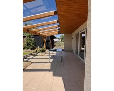 Hinter der Küche befindet sich das Wohnzimmer mit dem genannten handgefertigten Warmluft-Kachelofen mit einer Sitzbank aus Kambalaholz und einem wunderschönen Blick auf die mit Panzerglas und Holz überdachte Terrasse und in den liebevoll angelegten und gepflegten Garten mit Grillkamin.