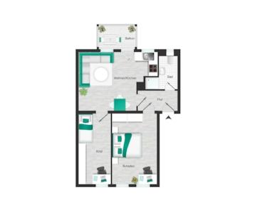 Der gut durchdachte Grundriss schafft ein angenehmes Wohngefühl: Das Herzstück der Wohnung bildet der helle Wohnbereich mit offener Küche, der nahtlos in den Balkon übergeht – perfekt für entspannte Stunden im Freien. Das Schlafzimmer ist großzügig geschnitten und ruhig gelegen. Ein weiteres Zimmer eignet sich ideal als Kinder-, Arbeits- oder Gästezimmer. Das Tageslichtbad ist funktional ausgestattet und mit einer Dusche versehen, der zentrale Flur verbindet alle Räume auf kurze Wege.