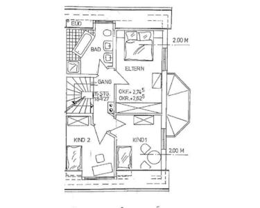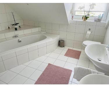 Das Obergeschoss verfügt über drei gut geschnittene Schlafzimmer sowie ein modernes Badezimmer. Hochwertiger Parkettboden (2016 erneuert) sorgt für eine warme Wohnatmosphäre. Das gesamte Obergeschoss ist mit Fußbodenheizung ausgestattet. Das Badezimmer ist mehr als großzügig. Hier befindet sich ein Doppelwaschbecken, ein WC, eine Badewanne sowie eine Dusche.