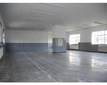 Der Raum auf der 1. Etage ist gut belichtet und wurde früher als Werkstatt und zuletzt als Atelier genutzt. Die teilweise noch alten Industriefenster und die offene Fläche geben dem Raum einen besonderen Charakter und erlauben eine flexible Nutzung.