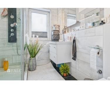 Das modernisierte Tageslichtbad (Sanierung im Jahr 2019) ist mit einer großzügigen Dusche ausgestattet und vermittelt durch helle Materialien ein freundliches Ambiente.