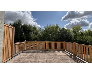 Im ersten Obergeschoss befindet sich eine Wohnung mit einem großzügigen Wohnzimmer, einem Tageslichtbadezimmer mit Badewanne und Dusche und einem Schlafzimmer. An die Küche wurde eine hochwertige Holzterrasse angebaut.