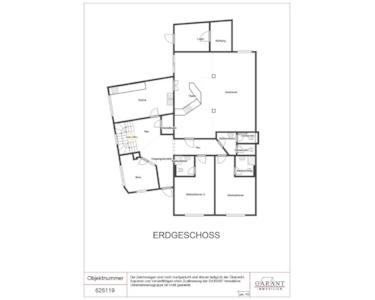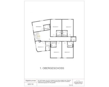 Im Erdgeschoss befinden sich der ca. 60 qm große Gastraum mit Zugang zum Innenhof, die Küche, das Büro, eine Gäste-Toilette sowie zwei Gästezimmer mit je einem Badezimmer.