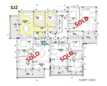 Die Wohnung SJ1 mit einer Gesamtnutzfläche von 54 m² (Wohnfläche 39,37 m² + Terrasse 10,10 m² + Garten 5 m² + Parkplatz 15 m²) befindet sich im Erdgeschoss. Sie besteht aus einem Schlafzimmer, einem Badezimmer, einem Wohnzimmer mit Küche und Essbereich sowie einer überdachten Terrasse. Zur Wohnung gehört ein Parkplatz.