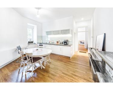 Die großzügig gestaltete, offene Küche ist vollständig ausgestattet mit einem Backofen, Ceranfeld, einem Kühlschrank sowie einer Geschirrspülmaschine und bietet Ihnen zudem genügend Stellraum für einen großen Esszimmertisch, welcher sich ebenfalls auch hervorragend als Besprechungsort nutzen lässt.