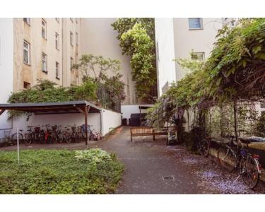 Trotz der zentralen Lage bietet die Wohnung eine angenehme Ruhe. Der großzügige Innenhof ist funktional gestaltet und verfügt über Sitzbänke, einen Sandkasten und überdachte Fahrradständer. Dank des Denkmalschutzes bleibt der einzigartige Altbaucharakter bewahrt und sorgt für eine geschützte Wohnkultur mit besonderem Flair.