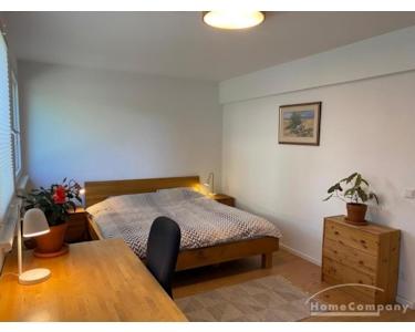 Helles Wohnzimmer mit großen Fenstern und Zugang zur großen Terrasse. Blick in den Quartier-Garten/Park. Zwei möblierte Schlafzimmer (inkl. Schreibtisch), ein Schlafzimmer hat auch Zugang zur Terrasse. Bad mit Badewanne. Waschmaschine in der Wohnung. Die Wohnung liegt am ruhigen Innenhof.