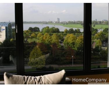 Breathtaking! Merely the view through the panoramic windows, overlooking the Rhine, Rheinturm TV tower, the MedienHafen, Town Hall and right to the Altstadt, leaves a lasting impression. The living area offers a cosy corner sofa and smart TV. A desk provides a home office working space. The dining table is positioned near the entrance to the separate kitchen, and offers seating for six people. The modern fitted kitchen offers a ceramic hob, oven, dishwasher, fridge-freezer, microwave and a selection of commonly used tableware and cooking utensils. The bedroom is furnished with a high quality, good as new, extra-large (2.00m x 2.10m) box spring bed and a spacious wardrobe. And of course, it also offers a fantastic view towards the Stadthaus and of Unterbilk. The tastefully appointed bathroom offers a bath with shower fitting and mounted partition. In the entrance hall, you will find a coat rack and spacious built-in wardrobe. The separate guest WC represents an additional convenience. A washing machine is available for your sole use. The apartment will be completely renovated before it is rented out, so the photos do not reflect the current color scheme.
