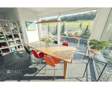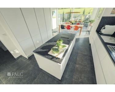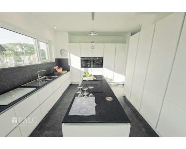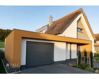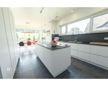 Ein echtes Zuhause zum Verlieben! Dieses im Jahr 2022 in sehr hochwertiger Massivbauweise errichtete Einfamilienhaus begeistert mit zeitgemäßer Architektur, exzellenter Bauqualität und einer durchdachten Raumaufteilung, die modernes Wohnen perfekt in Szene setzt. Auf einer Wohnfläche von ca. 150 m² verteilen sich sechs Zimmer, darunter zwei großzügige Schlafzimmer, zwei Gästezimmer, drei stilvolle Duschbäder sowie ein offener Wohn- und Essbereich mit Zugang zur sonnigen Südterrasse. Die hochwertige Küche mit Kochinsel lädt zum Kochen und Verweilen ein. Große Panoramafenster mit integrierter Schiebetür schaffen ein lichtdurchflutetes Wohnambiente. Dabei sichern die dreifach verglasten Kunststofffenster eine hervorragende Wärmedämmung.