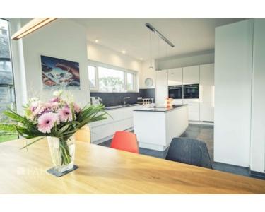 Das Herzstück des Hauses bildet der offen gestaltete Wohn-Ess- und Kochbereich. Die hochwertige,