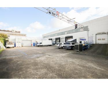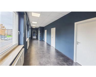 Der Gewerbekomplex befindet sich auf einem eingezäunten Areal und besteht aus einem dreigeschossigen Bürogebäude mit angrenzender Halle.