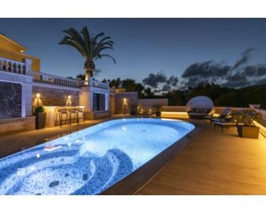 Der traumhafte Außenbereich begeistert mit einem gepflegten Garten, Jacuzzi, Wasserfällen und einem tollen beheizten Pool – ideal, um die magischen Tage und Nächte auf der bezaubernden Insel Mallorca in vollen Zügen zu genießen.