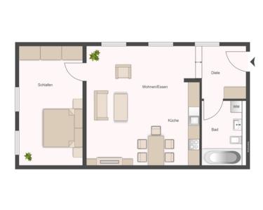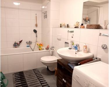 Das helle und geräumige Schlafzimmer lädt zum Entspannen ein, während das schöne Badezimmer mit Badewanne und Waschmaschinenanschluss hohen Komfort bietet. Die verwendeten Laminat- und Fliesenböden unterstreichen die angenehme Wohnatmosphäre.
