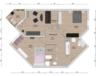 Die Wohnfläche beträgt 84,93 m². Die Wohnung verfügt über zwei Schlafzimmer, einer Küche, Wohnzimmer mit Balkonzugang, Duschbad, einem Abstellraum und Keller. Der Vinyl-Designerboden in Holzoptik in den Wohnräumen verleiht der Wohnung ein gemütliches Wohngefühl. Ein Stellplatz ist auf dem Gelände vorhanden. Die Wohnanlage wird durch einen Hausmeister- und Reinigungsservice betreut.