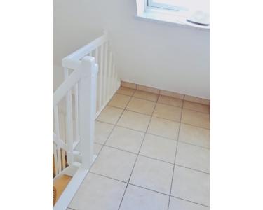 Die Eingang-, Wohn- und Essbereiche sind mit Laminatboden ausgelegt. Ein Stauraum im Flur dient als Garderobe.