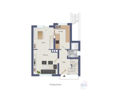 Erdgeschoss: Wohn-Essbereich mit Zugang zur Terrasse, Küche, Diele mit Gäste-WC und Dusche