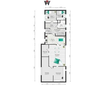 Im Erdgeschoss erwartet Sie eine zentrale Diele, zwei verbundene Zimmer sowie ein Bad im Ausbau. Die Grundrissanlage ermöglicht mit überschaubarem Aufwand die Realisierung einer Einliegerwohnung. Herzstück ist die ca. 18 m² große Wohnküche mit direktem Zugang zur großzügigen, windgeschützten Terrasse. Im Obergeschoss stehen ein helles Wohnzimmer, ein Schlafzimmer, ein großes Tageslichtbad und eine eindrucksvoll geräumige Diele (ca. 23 m²; ideal als Arbeits-, Spiel- oder Bibliotheksbereich) zur Verfügung. Unter dem Dach bietet eine Ausbaureserve von rund 68 m² zusätzliche Optionen – vom Atelier bis zu weiteren Schlafräumen.