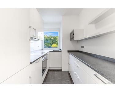 Ein besonderes Highlight ist der unverbaute Blick in die gepflegten Gartenanlagen der Wohnanlage. Die Grünflächen vermitteln Ruhe, Weite und eine angenehme Distanz zum urbanen Umfeld – ein seltenes Zusammenspiel aus Stadtleben und naturnahem Wohnkomfort.
