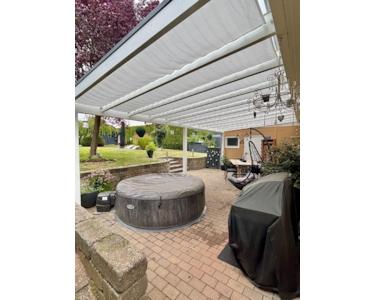 Vom Wohnzimmer aus geht man auf die Terrasse, welche ca. 32qm groß ist. Diese ist in einer Größe von 8m x 3,70m überdacht. Im Sommer kann man es sehr lange draußen aushalten, und bei schlechtem Wetter trotzdem die Wäsche draußen aufhängen. Es ist auch kein Problem in den Übergangsmonaten draußen zu sitzen, da der Garten etwas höher liegt (windgeschützt).