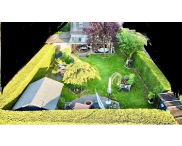 Über fünf Stufen gelangt man in den liebevoll angelegten Garten, der bereits mehrere Metamorphosen durchlaufen hat. Er verfügt über mehrere Loungebereiche, einen Schuppen für Gartengeräte und Holzlagerung und über ein Gartenhäuschen. Der Garten ist insgesamt mit 78m laufender Hecke eingefriedet.