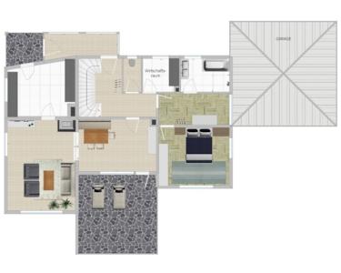 - - EG: großer Wohn-/Essbereich, Küche, Schlafzimmer, Ankleide, Bad, WC, Wirtschaftsraum