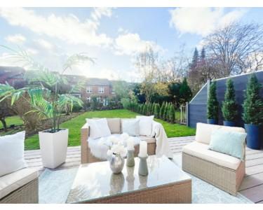 Von hier betreten Sie die neue, einladende WPC-Terrasse mit Blick in den hübsch gestalteten Garten mit Südausrichtung. Neue Sichtschutzwände und eine Hecke schaffen Privatsphäre. Auch im hinteren Garten wurde kürzlich neuer Rollrasen verlegt und ein Steingarten liebevoll angelegt.