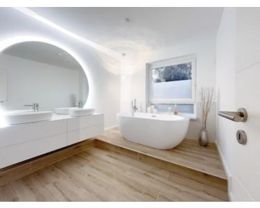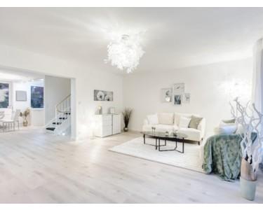 Weißeichenoptik und wurde (bis auf das Vollbad) durchgehend im ganzen Haus verlegt.