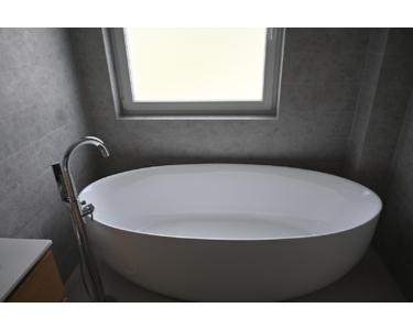 Luxuriöses Badezimmer: Das moderne Badezimmer lässt keine Wünsche offen. Es verfügt über eine begehbare Dusche mit Glasabtrennung, eine freistehende Badewanne sowie stilvolle Armaturen und Sanitärobjekte.