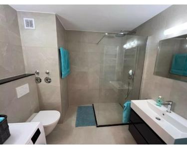 Das neue, stilvoll gestaltete Badezimmer verfügt über ein WC, ein Waschbecken, eine Regendusche, eine Handbrause sowie eine Waschmaschine.