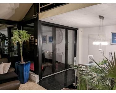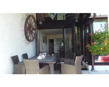 Über eine moderne stufenlose Faltschiebetür gelangt man vom Wohnzimmer direkt auf die überdachte und windgeschützte Terrasse mit Blick auf den schön angelegten Gartenteich mit Wasserfall.