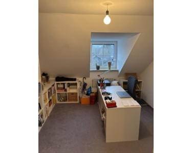 Über eine Holztreppe im Eingangsbereich kommt man in die zweite Etage der Wohnung, in der sich ein großes Schlafzimmer, ein Bad mit Badewanne und WC und eine Galerie, die z.B. als Büro genutzt werden kann, befinden.