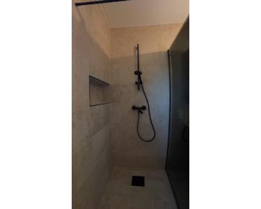 Badezimmer: Limestone Fliesen cream/matt 30x60x0,8 + Mosaikfliesen cream/matt in der barrierfreien Dusche, Fußbodenheizung