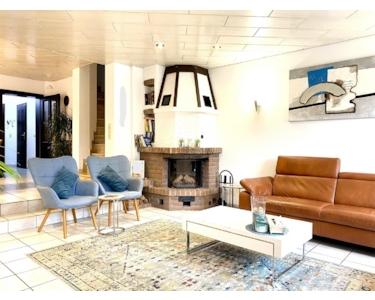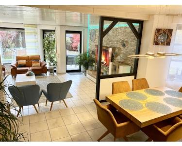 • Lichtdurchfluteter Wohnbereich mit Kamin