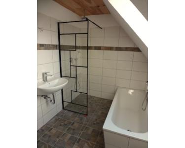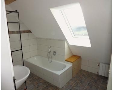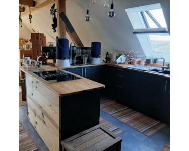 Umbau eines Bauernhauses durch einen Handwerksmeister. Die Wohnung ist komplett neu in der ehemaligen Scheune enstanden. Ökologische Bauweise, Holzfaserdämmung mit Mineralputz, viel unbehandeltes Holz. Neues Tageslichtbad mit Badewanne und Walk-In Dusche.