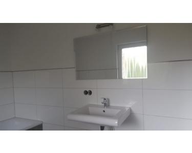 Neues Bad mit gefliester Edelstahl Bodenablaufrinne in der Dusche, eine Kopfbrause und 4 Körperdüsen (von Grohe).