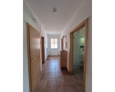 Flur, von diesem Zugang zum HWR mit Abstellmöglichkeit und Waschmaschinenanschluss, Duschbad, abgeschlossene Küche (Öffnung zum Wohn-Esszimmer möglich), Abstellkammer, möbliertes Wohn-/Esszimmer mit Zugang zum sichtgeschützten Garten.