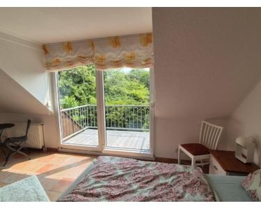 Elternschlafzimmer ( 22 qm) mit kleinem Balkon zum Garten , Doppelbett und großem Kleiderschrank, sowie Kommode und Sat TV;
