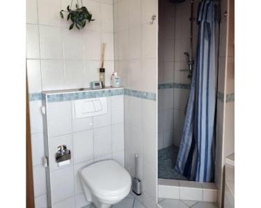 1 Bad/WC gefliest, mit geräumiger Dusche, Aufsatzwaschbecken, WC und Fenster