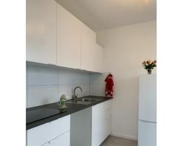 Weiße Einbauküche mit großem Kühlschrank, Spülmaschinen-Anschluß und Platz für einen Esstisch