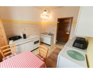 Ein Schlafzimmer ist mit einem Bett ausgestattet, in der Küche befindet sich eine kleine Einbauküche, Herd, Kochplatten, Kaffeemaschine, Schränke, ein Tisch mit zwei Stühlen. Im Wohnzimmer hat es schon ein Schlafsofa und diverse Schränke, einen Tisch und einen Sessel.